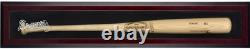The Atlanta Braves baseball bat display case is made of 1/8-thick acrylic and framed in a mahogany finished wood step frame. This case comes with a team logo and is either wall-mountable or could sit on a shelf or countertop.