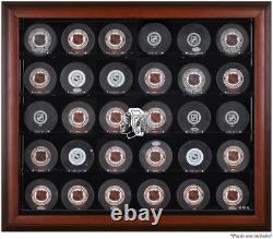 Officially licensed by the National Hockey League, the case is framed in a mahogany wood step frame and holds 30 pucks. It features 5 individual shelves which each house 6 pucks in circular openings that allow the puck to sit vertically. This display is made of 1/8th inch acrylic and is wall mountable. The base and back of the display are black acrylic and the front, sides and top are clear acrylic. Measures 24" x 22" x 4.
